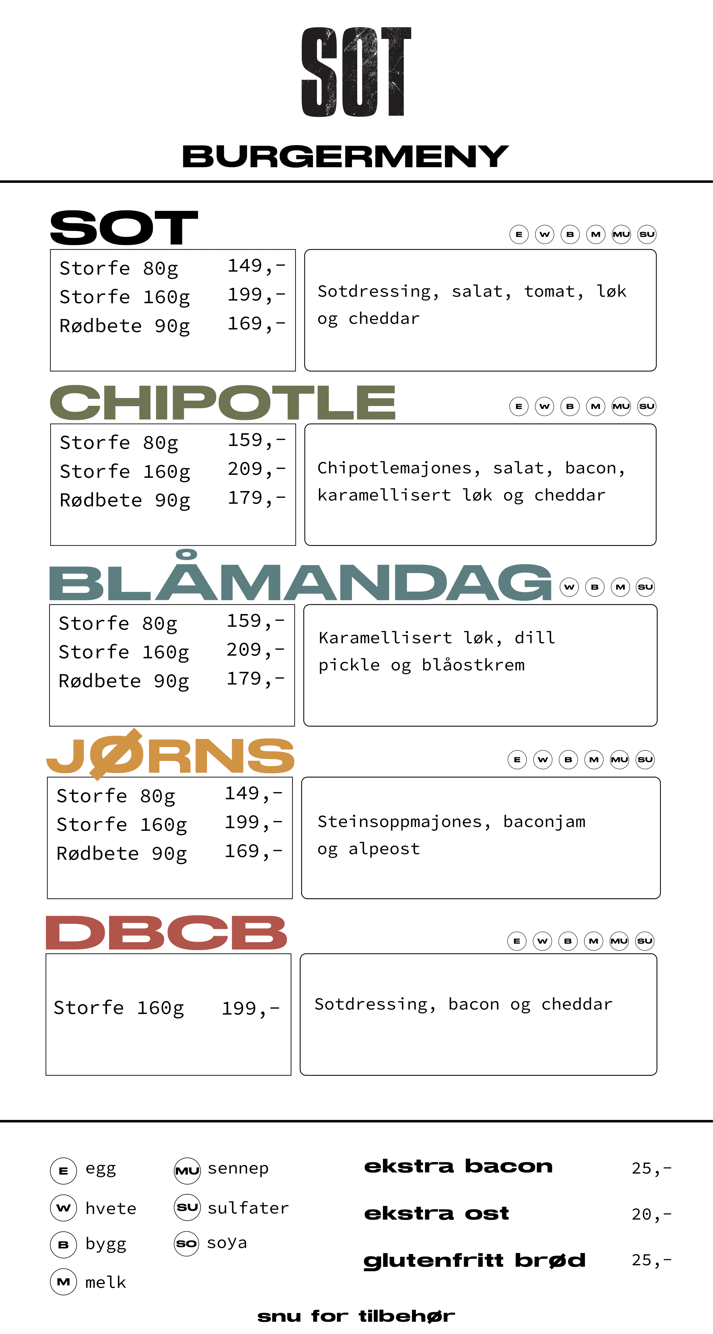 Menyen vår Velkommen til SOT Bar & Burger på Solsiden i Trondheim Psst, click here for menu in English 🍔 Oversikt over allergener finner du i allergiguiden Allergiguide Ta med burger'n hjem Bestill takeaway her! Les mer Dobbel Bacon Cheese! Stikk innom en av våre restauranter og unn deg en digg burger! Les mer Finn din nærmeste restaurant! Bestill bord