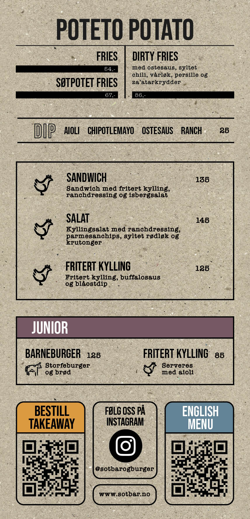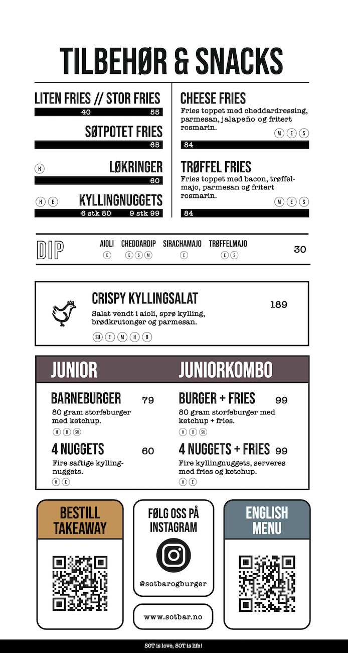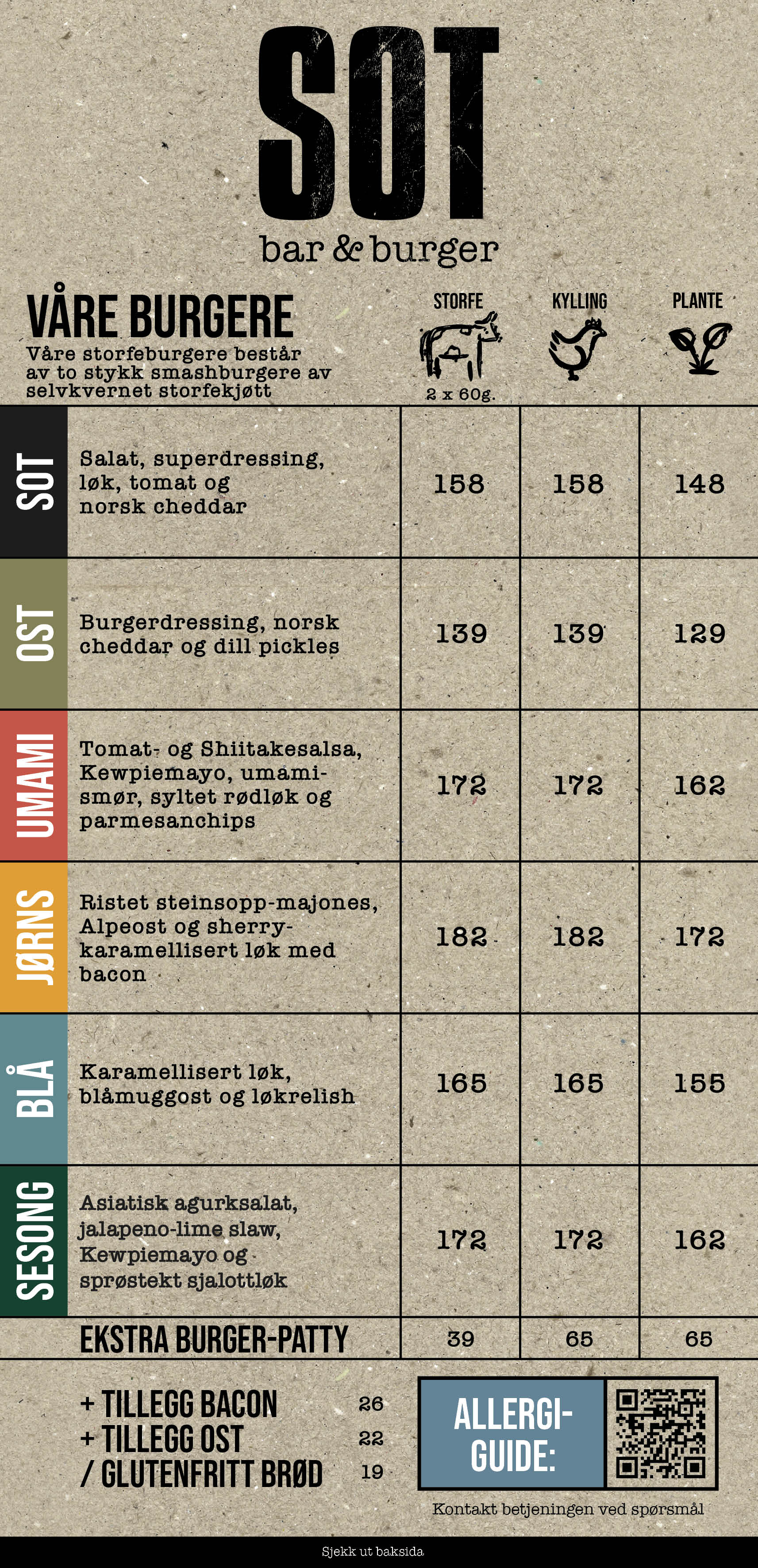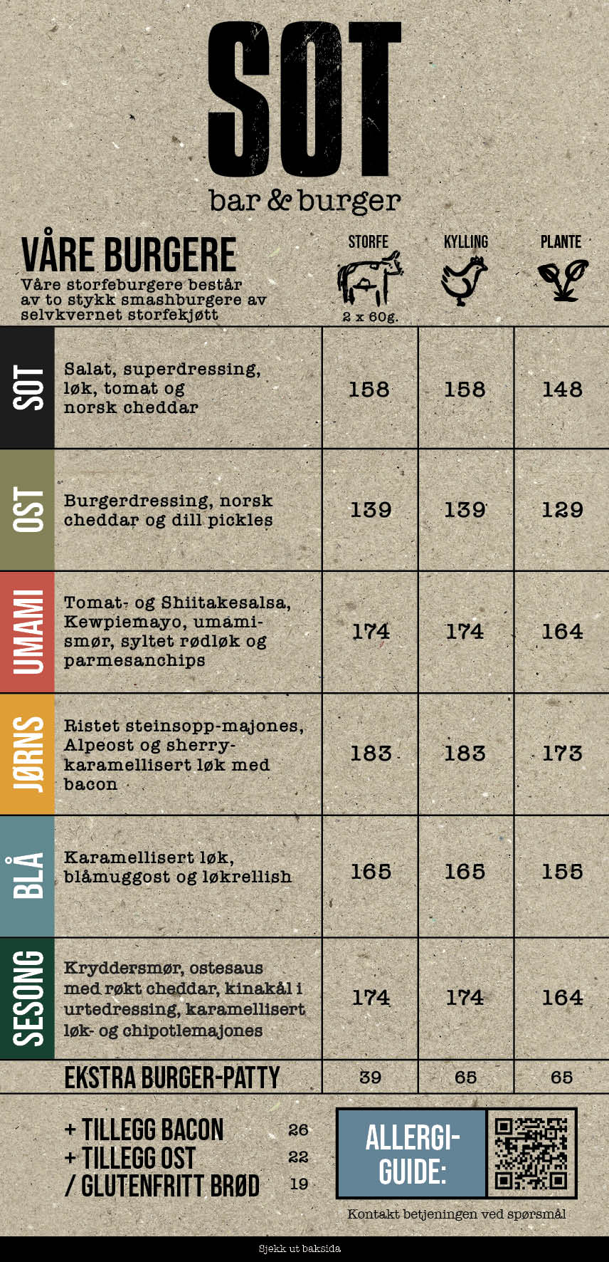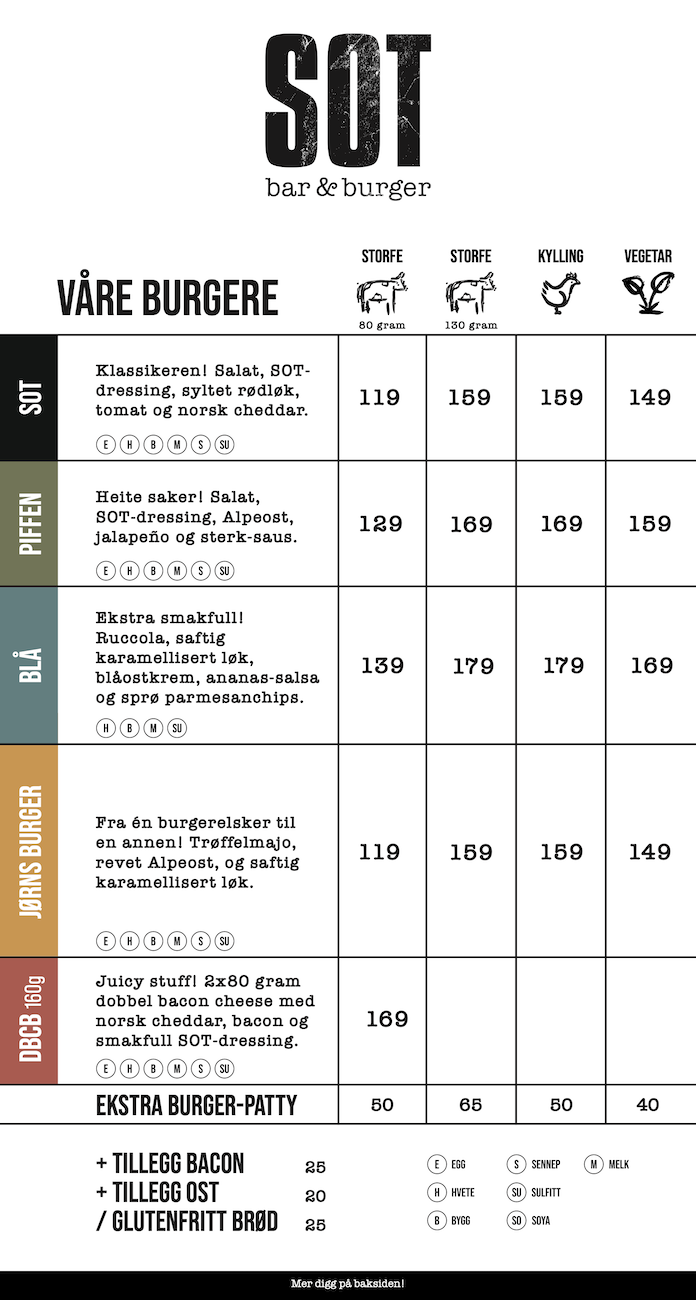 Menyen vår Velkommen til SOT Bar & Burger på Solsiden i Trondheim Psst, click here for menu in English 🍔 Oversikt over allergener finner du i allergiguiden Allergiguide Ta med burger'n hjem Bestill takeaway her! Les mer Dobbel Bacon Cheese! Stikk innom en av våre restauranter og unn deg en digg burger! Les mer Finn din nærmeste restaurant! Bestill bord